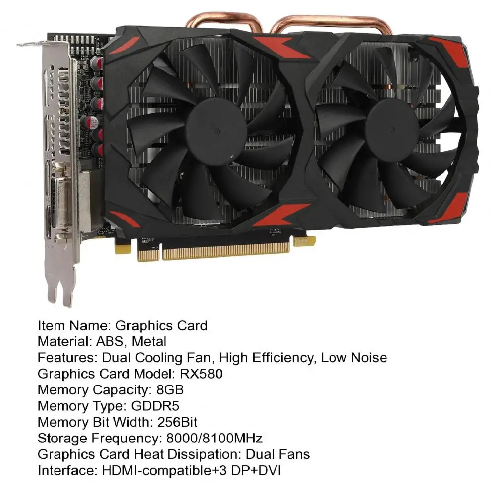RX580 Graphics Card High Efficiency Dual Cooling Fan 8GB GDDR5 256Bit Efficient Heat Dissipation Low Noise Memory Video Gaming Card Computer Accessories